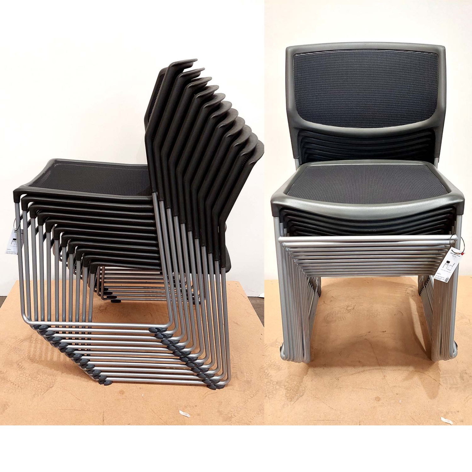 | Overview | Daylight mesh stacking chair sets new aesthetic and ecological standards for premium high density, multi-purpose stacking seating. The mesh seat and back conforms to the body, prevents pressure points from forming and provides a cool, comfortable sit. A combination of torsion bar frame and flexible resin back allows the chair to move with the user. Daylight weaves an exquisite mesh material around a clean, contemporary design. It blends seamlessly into various settings. Whether used as a solitary guest chair for a workstation or grouped en masse in an auditorium, Daylight's quiet "presence" adds an air of elegance to any environment. DAYLIGHT-457-BLK-SLV |